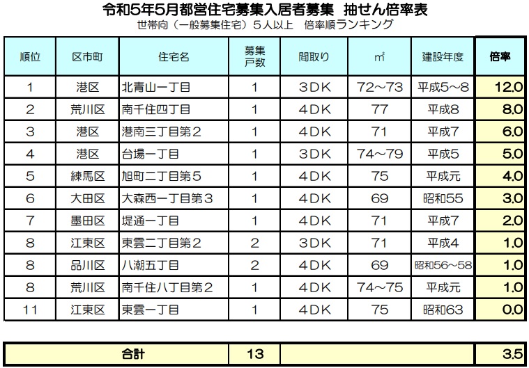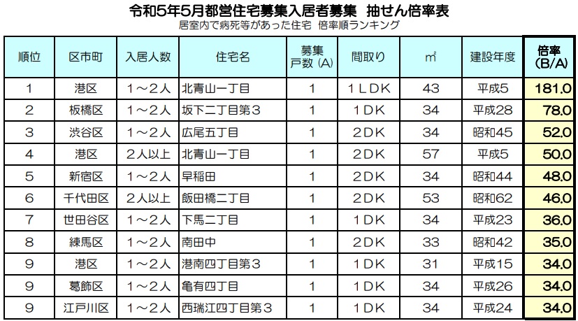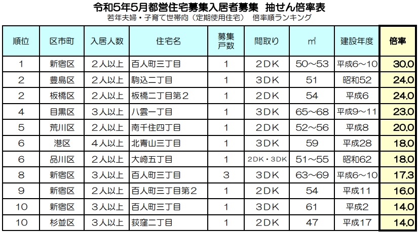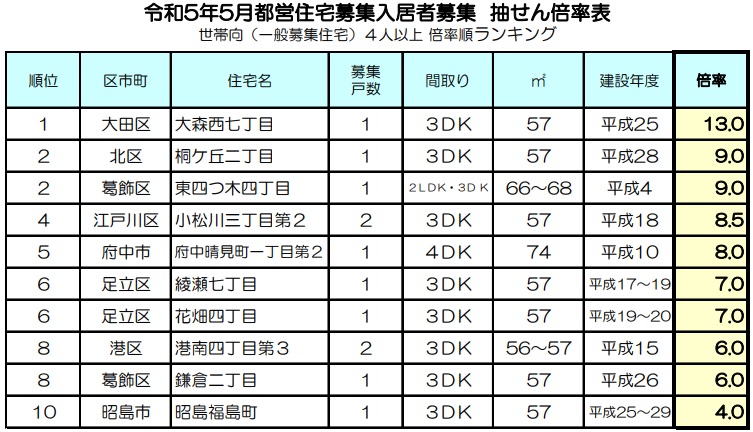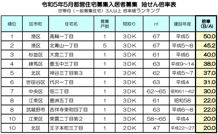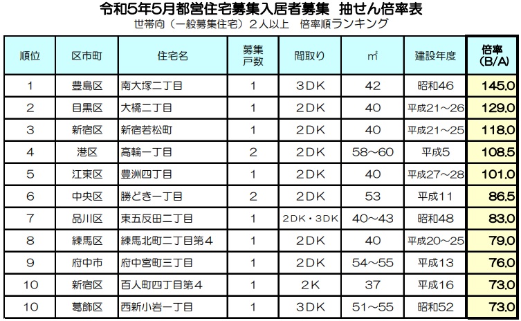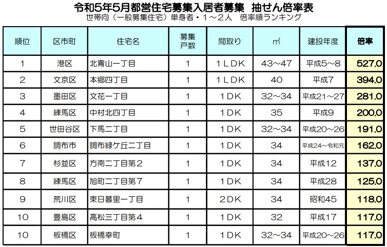 2023年(令和5年)5月募集都営住宅の抽選倍率を高い順からランキング化したものです。