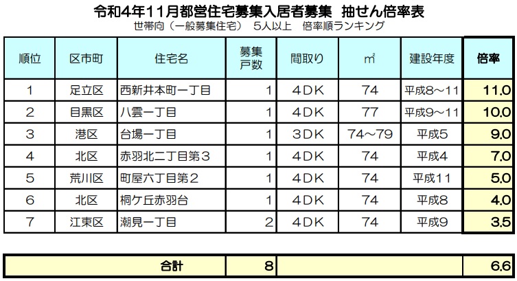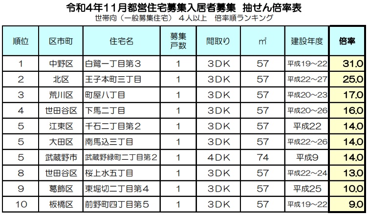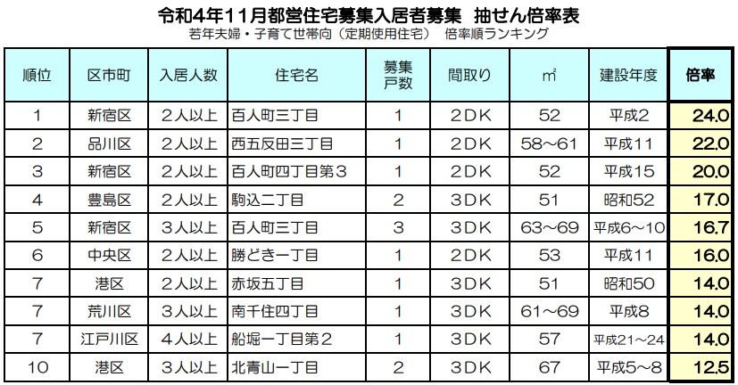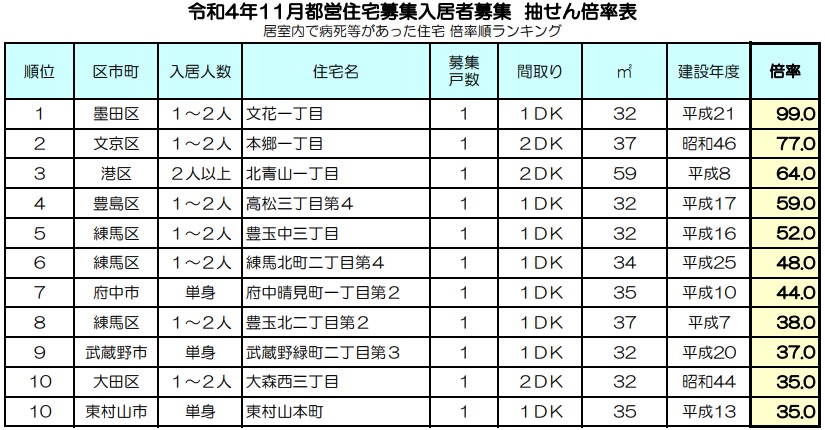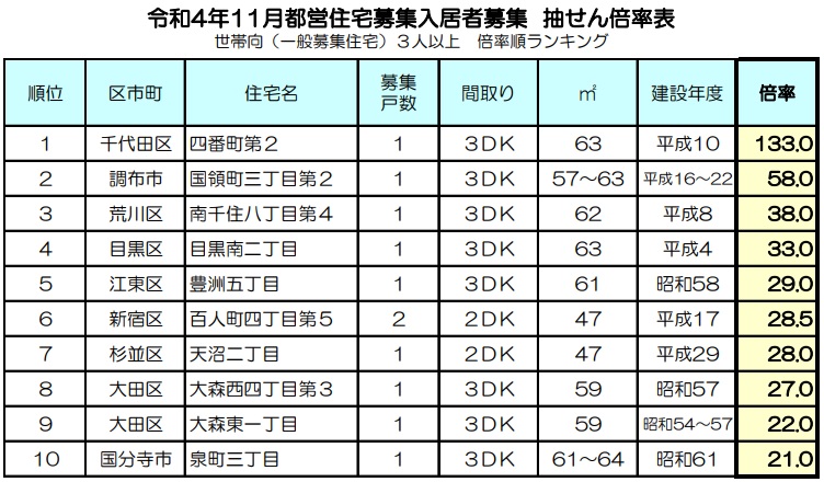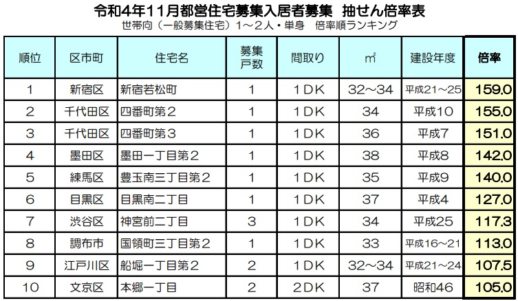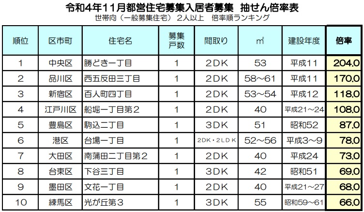 2022年(令和4年)11月募集都営住宅の当選倍率を高い順からランキング化したものです。