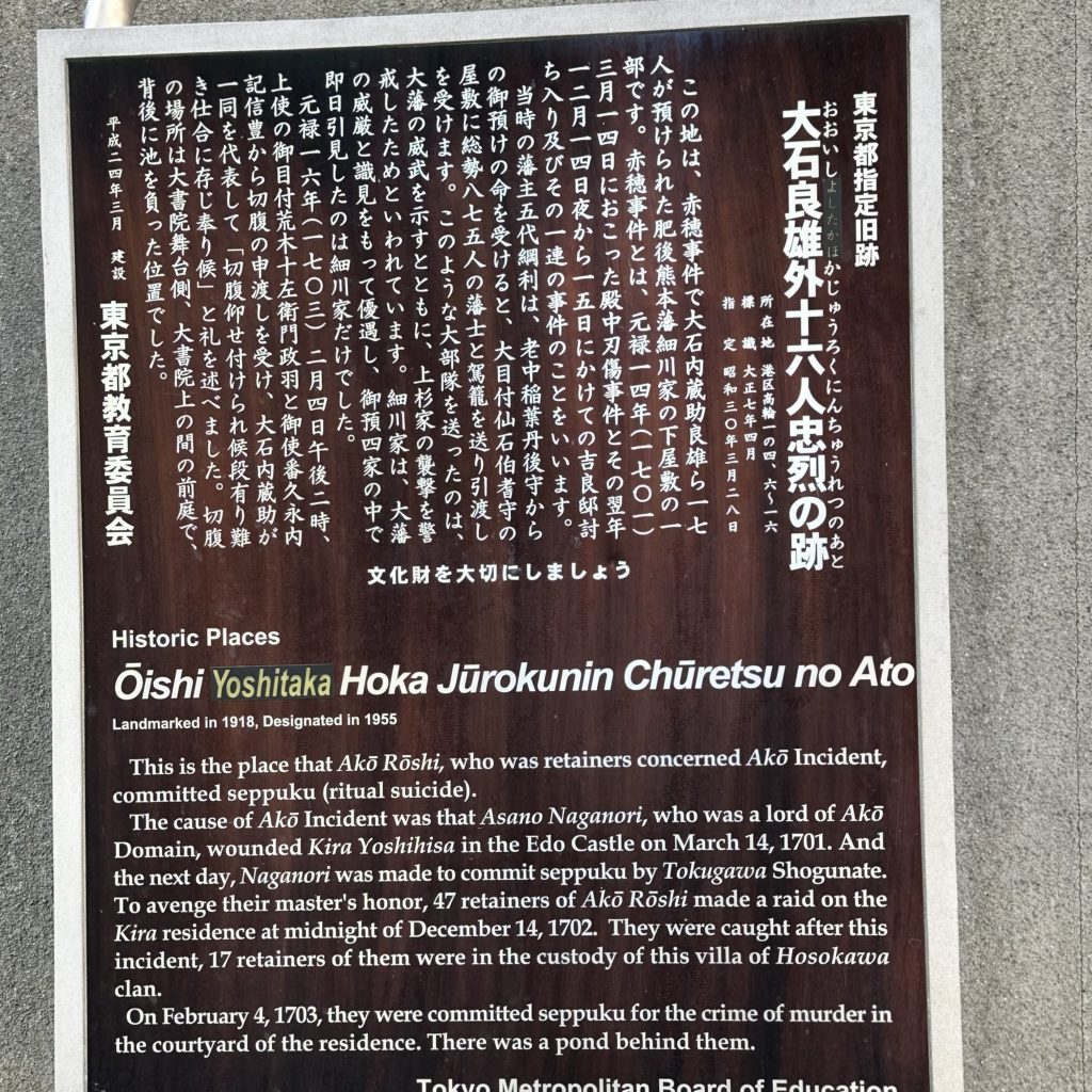 敷地のすぐ横に赤穂浪士の大石内蔵助他16人が自害した旧熊本藩細川家の下屋敷跡があります。